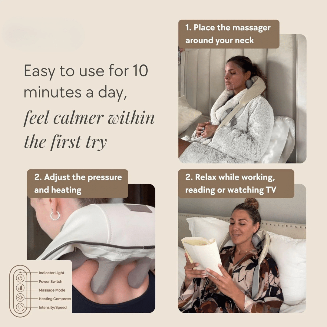 Noxa Massager is a cordless neck and shoulder massager that delivers deep‑kneading, “hand‑like” relief wherever you are. It combines adjustable intensity and soothing heat to melt away muscle tension, ease stiffness from long hours at a desk, and support better circulation.